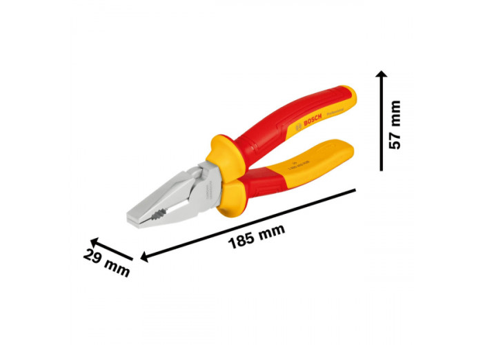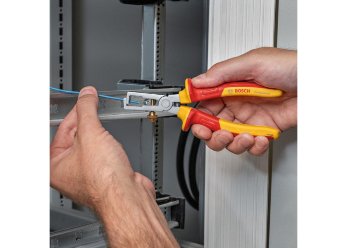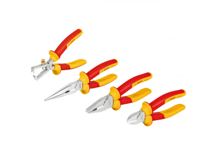 - Набір ізольованих плоскогубців Bosch Professional VDE з 4 предметів розроблений спеціально для професіоналів, яким важливе поєднання надійності, безпеки та зручності при роботі з електричними та механічними завданнями.