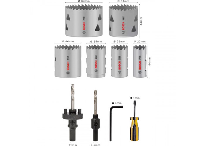 6 коронок | 2 перехідники шестигранник 11 мм з центруючими свердлами | 1 шестигранний ключ | 1 викрутка | Кейс