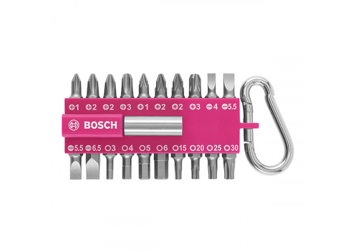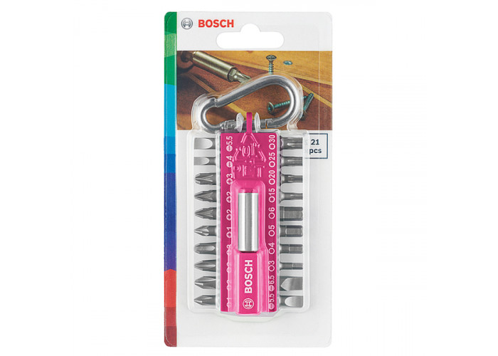 Набор из 20 насадок для завинчивания с держателем. Карабин для подвешивания набора. Маркировка типов и размеров шлицов бит. Пластиковый корпус розового цвета.
