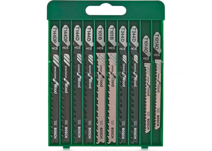 10 пильных полотен Bosch для распиливания древесины лобзиком в одном наборе. В комплект вошли по 2 полотна T 144 D, T 244 D, T 101 B, T 101 AO, T 144 DP.