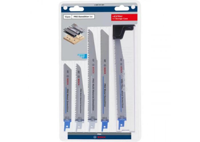 - Набір Bosch Pro Demolition Blade Set з 12 пиляльних полотен спеціально розроблений для використання при демонтажних роботах різних конструкцій з металу, деревини, пластику, кольорових металів та ін.