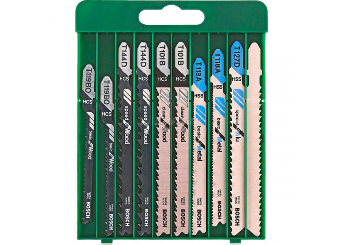 Набор пильных полотен Bosch по древесине и металлу для лобзиков различных производителей. В набор вошли по две пилки T 101 B, T 144 D, T 119 BO, T 118 A, T 127 D.