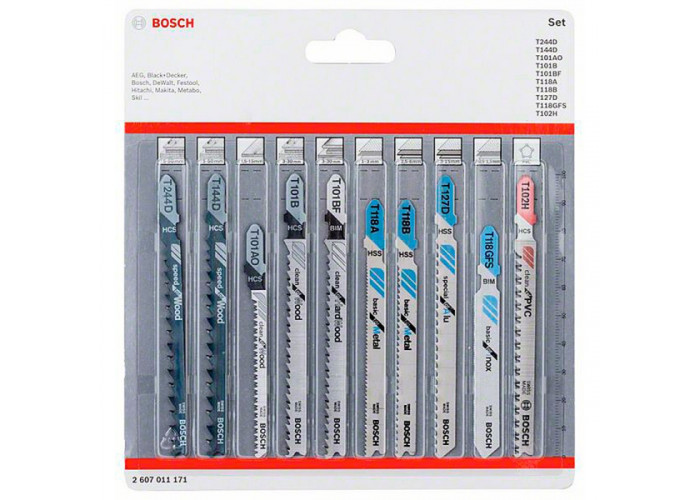 Набор из 10 пильных полотен Bosch для работы лобзиком по дереву, металлу, нержавейке.