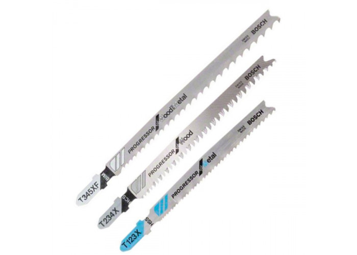 Набор из трех пильных полотен Bosch для быстрой и качественной обработки древесины, металла и пластмасс разной толщины. В комплект вошли пилки по металлу Progressor for Metal T 123 XF, по древесине Progressor for Wood T 234 X и по древесине и металлу Progressor for Wood and Metal T 345 XF.