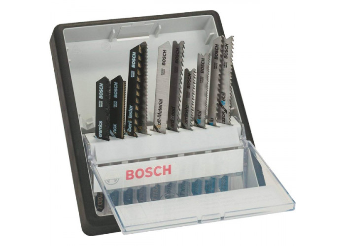 Набор из 10 пильных полотен Bosch Robust Line Top Expert для работы с керамикой, пластмассой, нержавеющей сталью, мягкими, акриловыми материалами, древесиной, гипсокартоном, ламинатом, металлом, алюминием. В пластмассовую коробку вошли пилки Special for Ceramics T 130 RIFF, Special for Inox T 118 AHM, Special for Fiber and Plaster T 141 HM, Special for Acrylic T 101 A, Special for Soft Material T 113 A, Clean for Hard Wood T 101 BF, Special for Laminate T 101 BIF, Flexible for Metal T 118 AF, Special for Alu T 227 D, Progressor for Metal T 123 X.