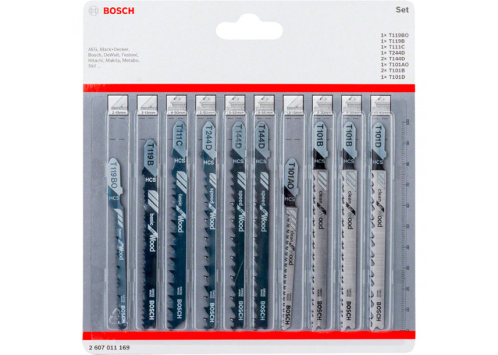 Набір з 10 пиляльних полотен Bosch для різання деревини лобзиком. У комплект увійшли пилки: T 119 BO Basic for Wood, T 119 B Basic for Wood, T 111 C Basic for Wood, T 244 D Speed for Wood, T 144 D Speed for Wood, T 144 D Speed for Wood, T 101 AO Clean for Wood, T 101 B Clean for Wood, T 101 B Clean for Wood, T 101 D Clean for Wood.