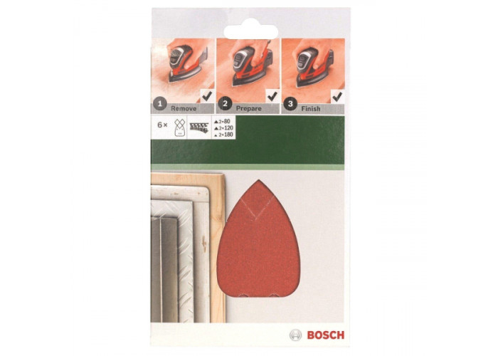 Комплект трикутноподібних шліфлистів Bosch складається із 6 шт. Їхні розміри — 95х135 мм, зернистість вимірюється 2х80, 2х120, 2х180. Розроблені для функціонування з побутовою шліфмашиною Bosch PSM Primo. Важить набір 0.05 кг.