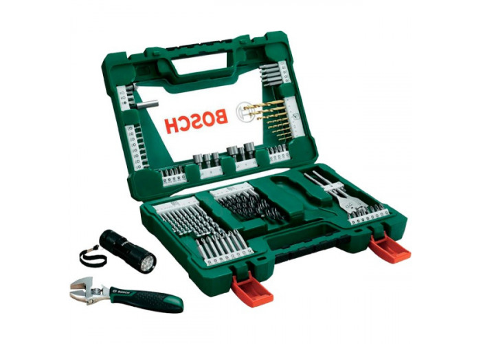 Набор Bosch V-Line состоит из 83 предметов. В практичный пластмассовый чемодан вошли сверла по камню, металлу и древесине, перьевые сверла, биты, торцевые ключи, зенкер и магнитный держатель для бит, раздвижной гаечный ключ и светодиодный фонарик.