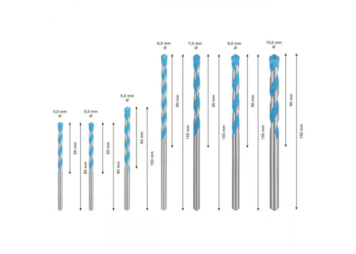 - Свердла розмірами: 5х50х85, 5.5х50х85, 6х60х100, 6х90х150, 7х90х150, 8х90х150, 10х90х150 мм.