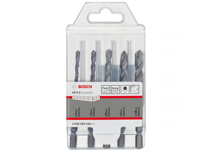 5 свердел Bosch Hex-9 Ceramic (діаметром 4, 5, 6, 8 і 10 мм) продумані для роботи у матеріалах, які швидко нагріваються, — мармурі, цеглі та керамічній плитці. Тип хвостовика — шестигранник 1/4”. Загальна довжина аксесуарів по 90 мм.