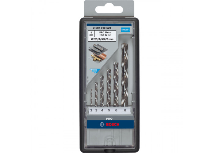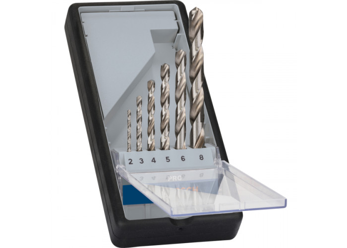 Набір Bosch свердел HSS-G по металу PRO Metal. В комплекті 6 свердел діаметрами 2 мм, 3 мм, 4 мм, 5 мм, 6 мм, 8 мм. Кут заточування вістря 135 градусів. Підходять для металу з вмістом заліза і для кольорових металів.