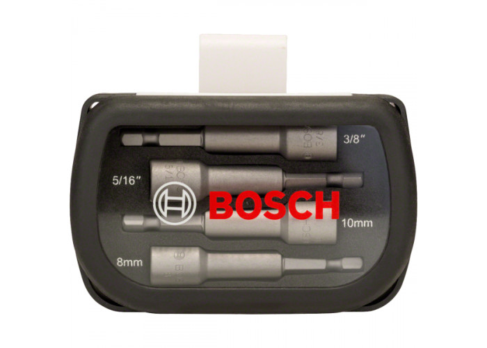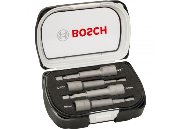 • 4 торцевых ключа Bosch длиной по 65 мм, размерами 8 и 10 мм, 3/8", 5/16", с хвостовиками 1/4" HEX и постоянным магнитом.
