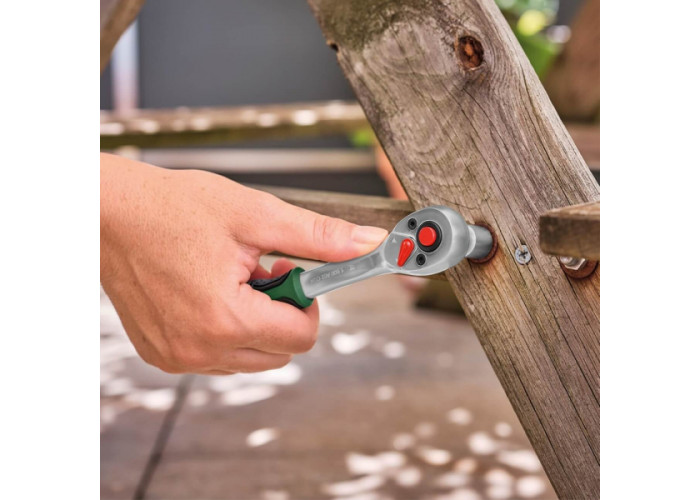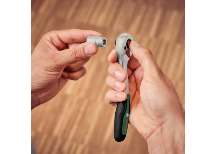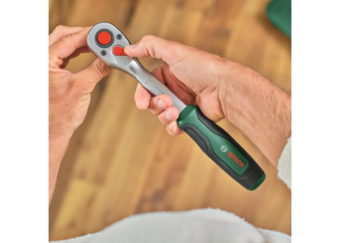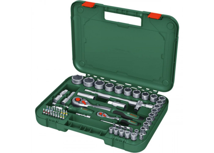 Універсальний набір інструментів Bosch для авто, ремонту, обслуговування техніки та іншого домашнього використання, що складається з тріскачок 1/2 і 1/4 дюйма, торцевих головок, викрутки і біт, а також адаптерів і подовжувачів. Інструменти виготовлені з міцної сталі S2, поставляються в практичному міцному кейсі. У наборі всього 57 предметів.