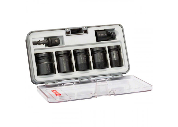 Ударні торцеві головки в наборі Bosch Impact Control: SW13, SW17, SW19, SW21, SW24 довжиною по 40 мм з хвостовиками внутрішній квадрат ½ дюйма. Плюс два перехідника — квадрат ½ дюйма на внутрішній шестигранник ¼ дюйма, шестигранник ¼ дюйма на квадрат ½ дюйма.