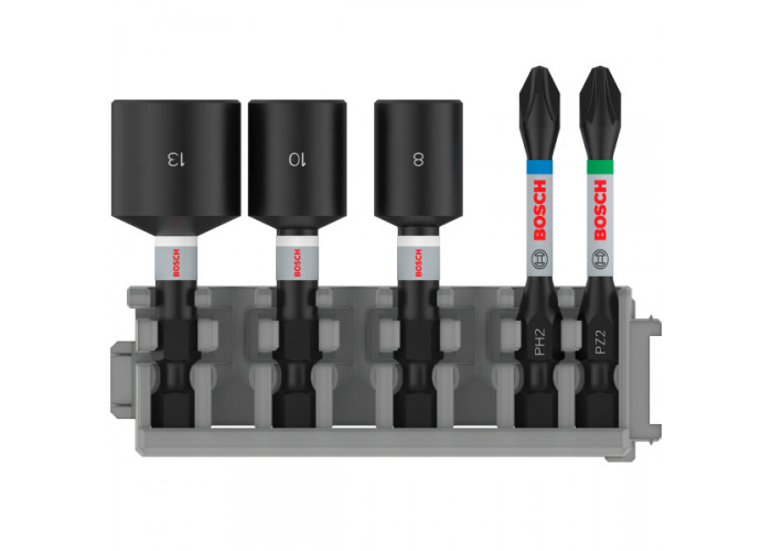 Набір Bosch Impact Control з 2 біт і 3 торцевих головок. Біти Ph2 і Pz2. Торцеві головки 8, 10 і 13 мм.