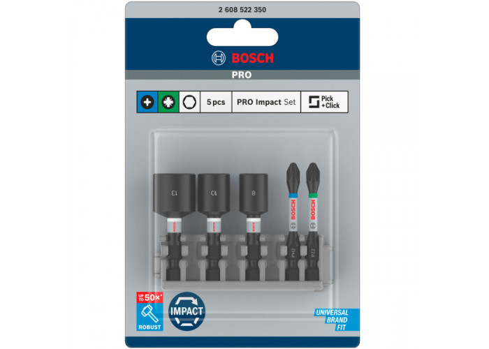 • Набір Bosch Impact Control містить 2 ударні біти і 3 торцеві головки.