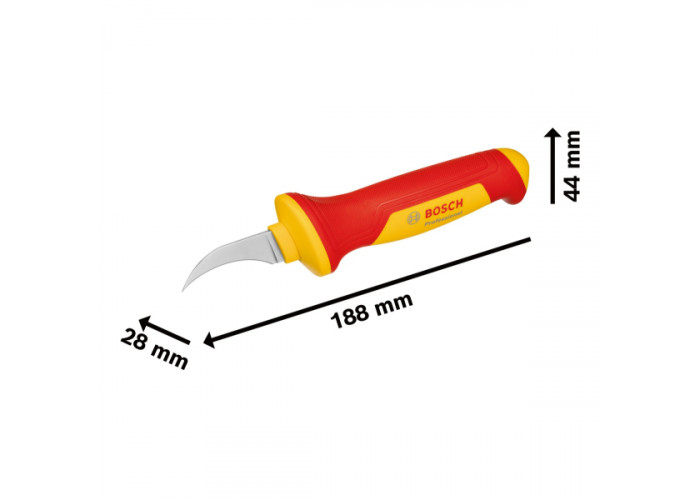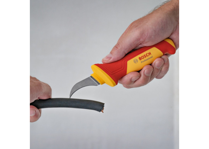 - Кабельний ніж Bosch Professional VDE з серпоподібним лезом – це надійний і безпечний інструмент, призначений для професійного використання в електромонтажних та інших технічних роботах.