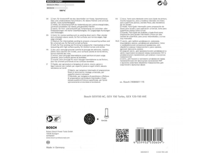 - Вона забезпечує стабільну та рівномірну роботу в поєднанні з ексцентриковими шліфувальними машинами Bosch Professional GEX 125-150 AVE, GEX 150 AC, GEX 150 Turbo, даючи змогу домагатися чудових результатів під час обробки різних поверхонь, зокрема дерева, лаку, фарби та інших матеріалів.