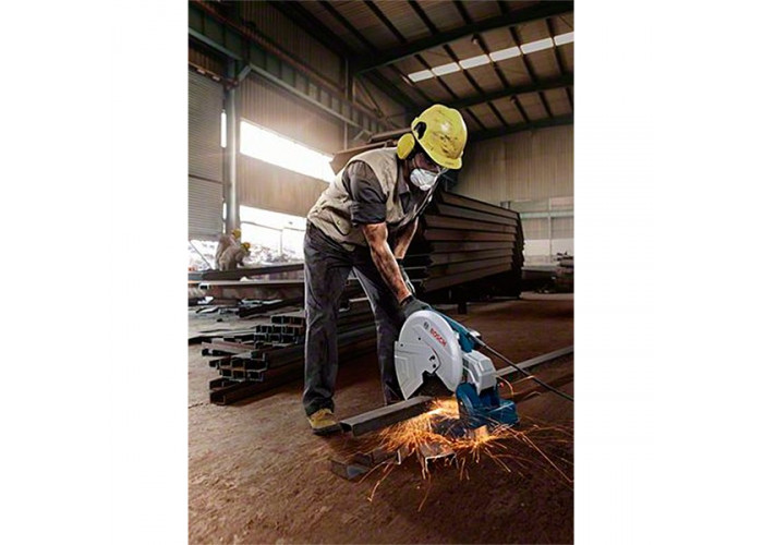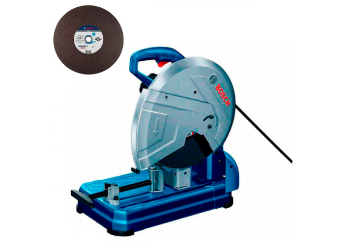 Настільна пила Bosch GCO 14-24 J потужністю 2400 Вт із швидкістю 3800 об/хв розрізає металеві вироби відрізними кругами 355 мм з отвором під посадку 25,4 мм. Продуктивність різання прямокутної заготовки під кутом 0 градусів 100x196 мм, квадратної — 119x119 мм, l-образного профілю — 130x130 мм. З кругом по металу Bosch PRO Metal 355×3.1×25.4 мм.