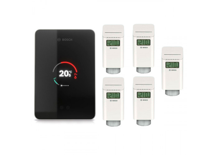 - Пакетна пропозиція Bosch EasyComfort 5AB містить кімнатний термостат EasyControl CT 200 B і п'ять термоголовок Smart Radiator Thermostat.