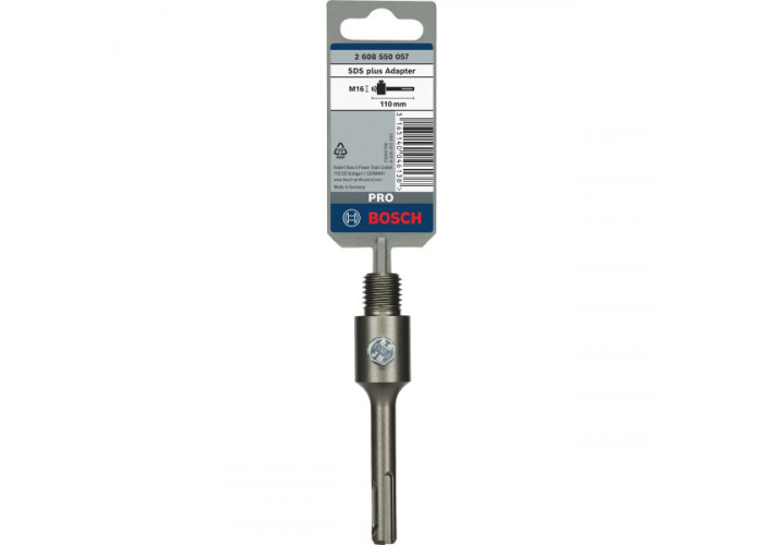 - Bosch PRO SDS-Plus Adapter використовується для підключення алмазних та інших свердлильних коронок з різьбленням M16 до дрилів та інших електроінструментів з шестигранним патроном.