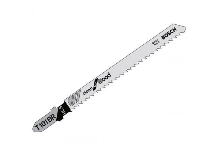 П'ять міцних пиляльних полотен Bosch Clean for Wood T 101 BR, виготовлених з високовуглецевої сталі, призначені для виконання чистих, без сколів з одного боку, прямолінійних пропилів деревини м'яких порід, ДВП, ДСП, столярних плит та плит з покриттям товщиною 3-30 мм. Загальна довжина кожної пилки 100 мм. Шліфовані, нагострені під вільним кутом зубці з кроком 2,5 мм роблять різ акуратним, без задирок та відколів. Хвостовик з одним упором.
