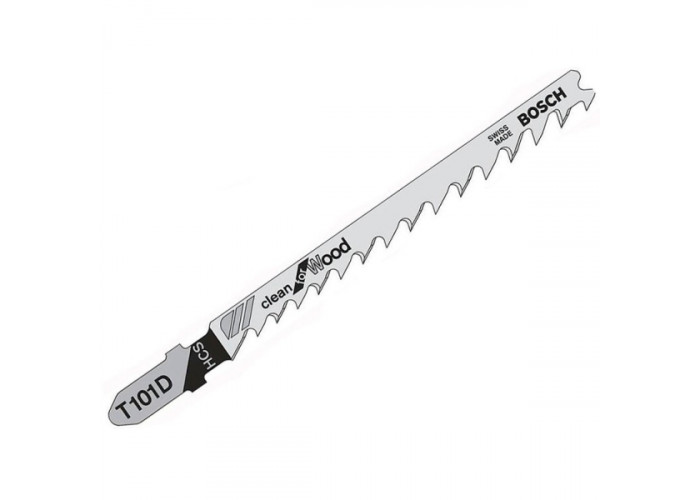 П`ять надійних пиляльних полотен Bosch Clean for Wood T 101 D, виготолвених із високовуглецевої сталі, для виконання чистих, без сколів з однієї сторони, прямолінійних пропилів деревини м`яких порід, ДВП, ДСП, столярних плит товщиною 10-45 мм. Загальна довжина кожної пилки 100 мм. Шліфовані, загострені, прогресивні зубці під вільним кутом з кроком 4-5,2 мм роблять різ акуратним, без завусениць та сколів. Хвостовик з одним упором.
