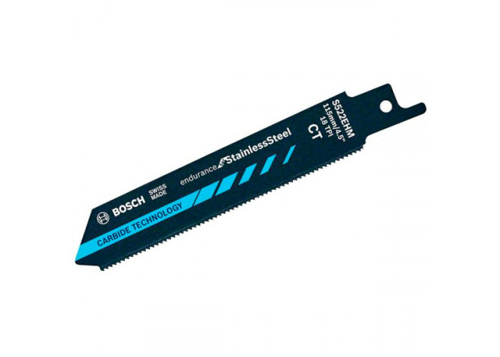 Короткая (115 мм) пилка Bosch S 522 EHM Endurance for Stainless Steel рассчитана на применение на компактных ножовочных пилах. Полотно из твердого сплава с кромкой, изготовленной по Carbide Technology. Тщательно отшлифованные зубья с шагом 1,4 мм, 18 TPI эффективно разрезают листовой металл толщиной 2-4 мм, профили из нержавейки, стеклопластик и эпоксидные материалы — до 50 мм.