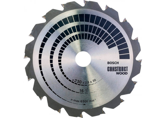 1,8-міліметровий по товщині циркулярний круг Bosch Construct Wood діаметром 230 мм з посадкою 30 мм для роботи на ручних дискових пилах. 16 зубів форми FWF з широкою опорою у спинці здійснюють грубий поздовжній різ шириною 2,8 мм у будівельній деревині, піноблоках, панелях, легко розрізаючи чужорідні включення.
