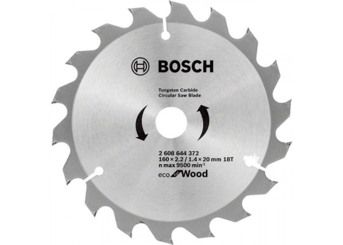 Для дискових пил циркулярний диск Bosch Eco for Wood товщиною 1,4 мм, діаметром 160 мм з посадкою 20 мм. 18 зубців форми ATB здійснюють точний, чистий різ шириною 2,2 мм у деревині будь-яких порід, будівельної, ДСП, МДФ, газо- та пінобетоні.