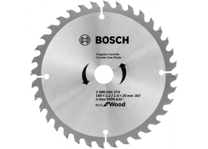 Для дискових пил циркулярний диск Bosch Eco for Wood товщиною 1,4 мм, діаметром 160 мм з посадкою 20 мм. 36 зубів форми ATB здійснюють точний, чистий різ шириною 2,2 мм у деревині будь-яких порід, будівельній, ДСП, МДФ, газо- та пінобетоні.