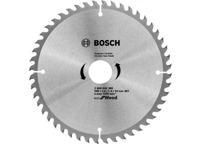 Для дискових пил циркулярний диск Bosch Eco for Wood товщиною 1,6 мм, діаметром 200 мм з посадкою 32 мм. 48 зубців форми ATB здійснюють точний, чистий різ шириною 2,6 мм у деревині будь-яких порід, будівельній, ДСП, МДФ, газо- та пінобетоні.