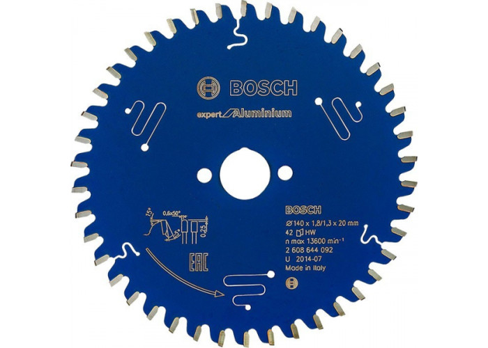 Bosch Expert for Aluminium — лучший пильный диск для аккуратных пропилов погружными пилами и ручными циркулярками в цветных металлах, а также пластмассе, эпоксидных, волокнистых материалах, поглощающих звук, изоляционных, легких строительных плитах. Его диаметр 140 мм, посадка 20 мм, толщина 1,3 мм. Прочнейшие 42 зуба формы HTLCG выполняют точный пропил шириной 1,8 мм.