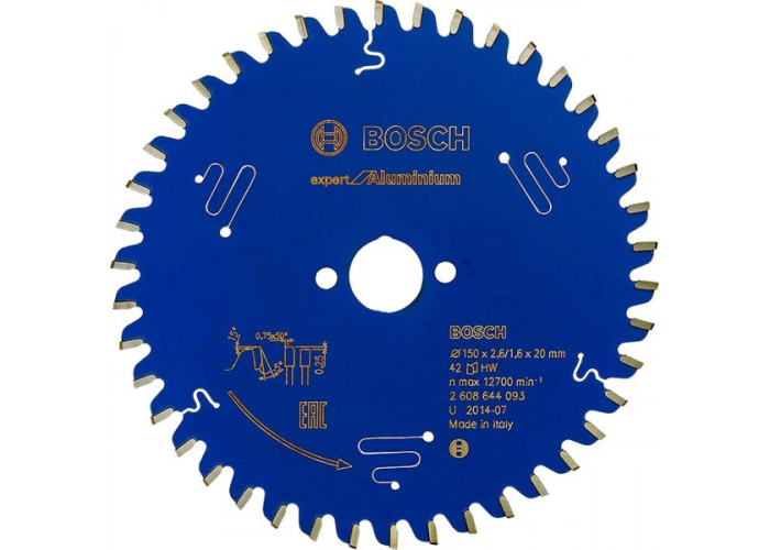Bosch Expert for Aluminium — кращий пиляльний диск для акуратних пропилів зануреними пилами та ручними циркулярками у кольорових металах, а також пластмасі, епоксидних, волокнистих матеріалах, ізоляційних, легких будівельних плитах. Його діаметр 150 мм, посадка 20 мм, товщина 1,6 мм. Прочнейшие 42 зуба форми HTLCG виконують точний пропил шириною 2,6 мм.