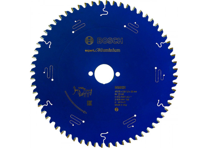 Bosch Expert for Aluminium — кращий пиляльний диск для акуратних пропилів зануреними пилами та ручними циркулярки у кольорових металах, а також пластмасі, епоксидних, волокнистих матеріалах, що поглинають звук, ізоляційних, легких будівельних плитах. Його діаметр 230 мм, посадка 30 мм, товщина 1,8 мм. Прочнейшие 64 зубів форми HTLCG виконують точний пропил шириною 2,8 мм.