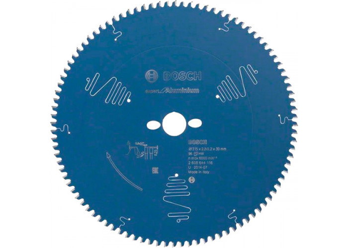 Bosch Expert for Aluminium — кращий пиляльний диск для акуратних пропилів зануреними пилами та ручними циркулярками в кольорових металах, а також пластмасі, епоксидних, волокнистих матеріалах, що поглинають звук, ізоляційних, легких будівельних плитах. Його діаметр 315 мм, посадка 30 мм, товщина 2,2 мм. Надміцні 96 зубів форми HTLCG виконують точний пропил шириною 2,8 мм.