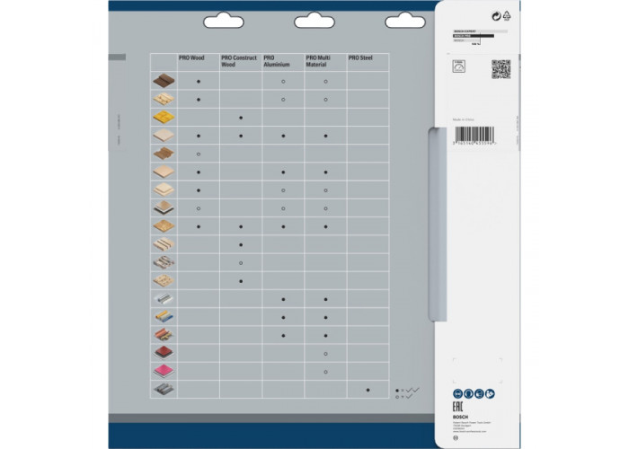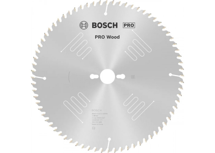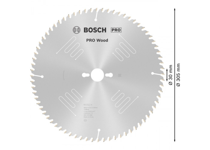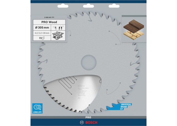 - Диск Bosch PRO Wood товщиною 2,2 мм діаметром 305 мм з посадкою 30 мм, з 72 зубами форми UW робить дуже тонкі поздовжні та поперечні різи шириною 3,2 мм у різних матеріалах.
