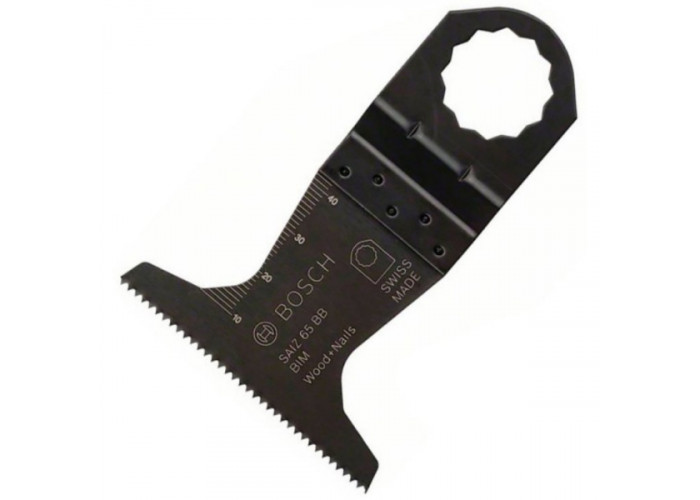 - Занурювальне пиляльне полотно Bosch SAIZ 65 BB, виготовлене з біметалу, шириною 65 мм та з робочою довжиною 40 мм призначене для розрізання деревині з цвяхами.