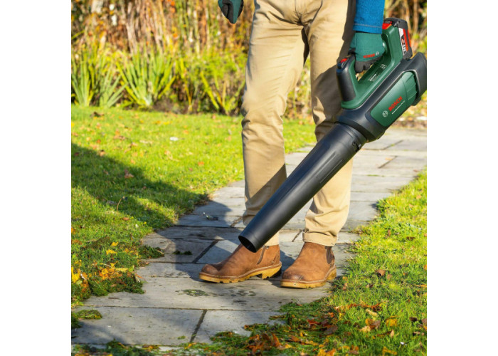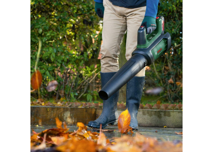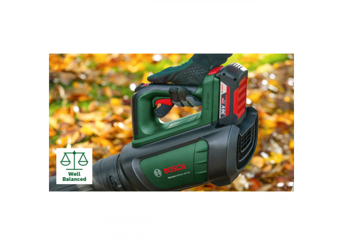 Bosch AdvancedLeafBlower 36V-750 – компактная воздуходувка для уборки листьев и другого мусора на приусадебніх участках. Модель запитывается от литий-ионного аккумулятора 36 В (в комплект не входит). Скорость потока воздуха можно регулировать в пределах 100-200 км/час. Без батареи инструмент весит 2,8 кг.
