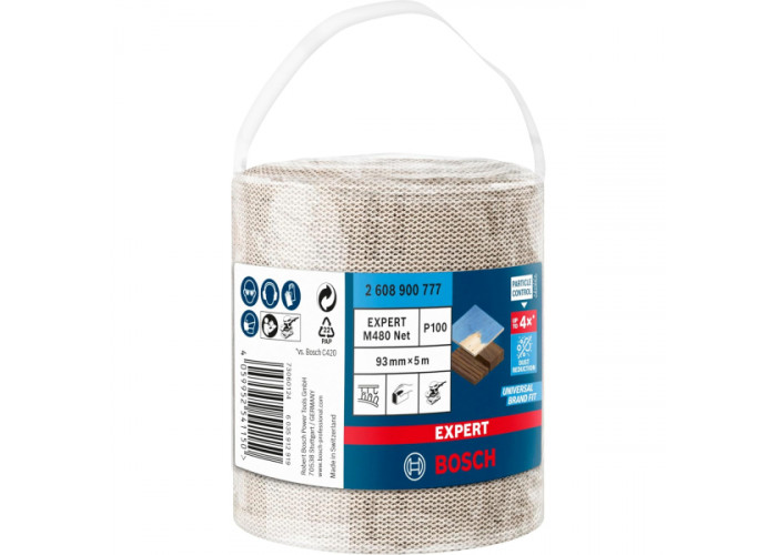 - Рулон шліфувальної сітки Bosch Expert M480 Net із зернистістю P100 — це сучасне рішення для високоефективного та практично безпилового шліфування різноманітних поверхонь, включно з деревом, лакофарбовими покриттями та гіпсокартоном.