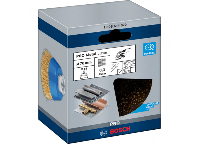 Чашечная щетка Bosch с резьбой M14, диаметром 70 мм, с проволокой толщиной 0,3 мм из латуни. Чистит медные, цинковые, никелированные поверхности. Подходит к угловым шлифмашинам, работающим с дисками 115 мм. Допустимое число оборотов 12500 об/мин.