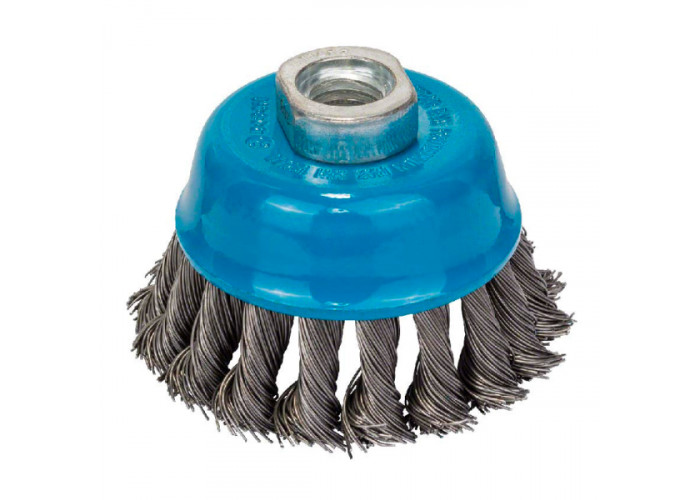 - Чашечная щетка Bosch с резьбой M14, диаметром 75 мм, со скрученной проволокой толщиной 0,5 мм из стали.