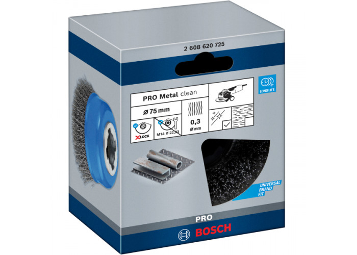 Зачистная чашечная щетка Bosch диаметром 75 мм с витой проволокой из стали толщиной 0,3 мм. Бесключевое крепление X-Lock. Предназначена для легкой, умеренной очистки средних и больших металлических поверхностей.