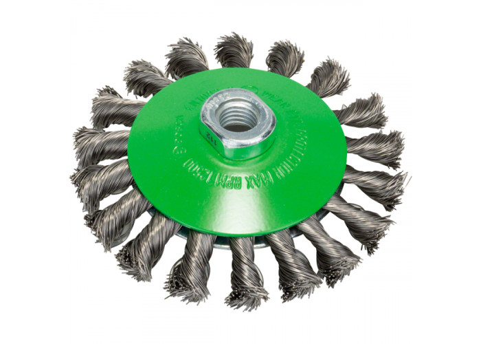 Щітка із скрученого дроту 0,35 мм з нержавійки. Щітка конічна 115 мм з посадкою M14. Для роботи на кутових шліфмашинах зі швидкістю не більше 12500 об/хв. Прекрасно обдирає та зачищає сталь, у тому числі нержавіючу, листові кольорові метали, чорні метали, алюміній.