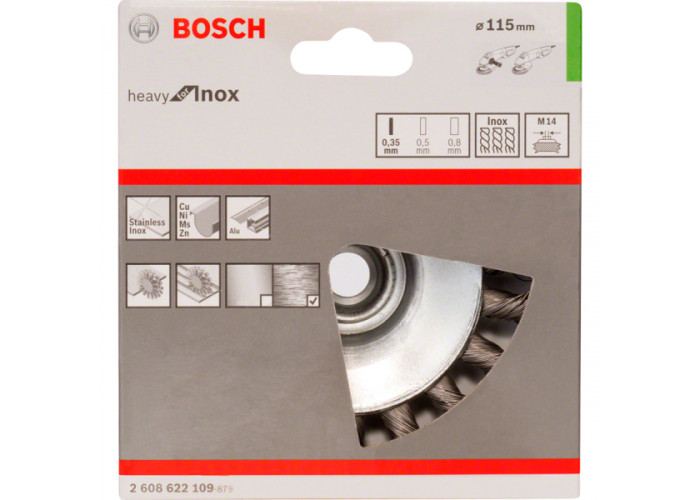 Опис щітки конічної Bosch нержавіюча 115 мм, 0,35 мм, M14:
