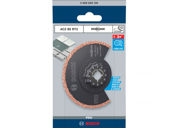 • Пиляльне полотно Bosch PRO ACZ 85 RT3 призначене для різноманітних робіт із будівельними та абразивними матеріалами. Наприклад, дозволить очистити шви від розчину або клею, прорізати кабельні канали в газобетоні.