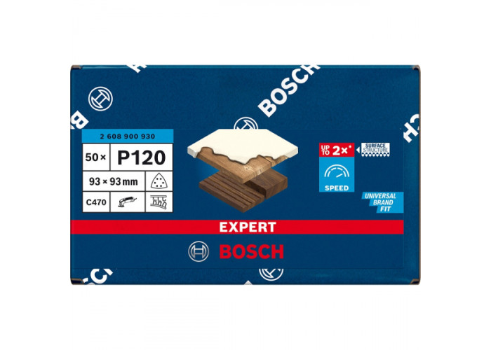 - Шліфувальні аркуші Bosch Expert 2608900930 із зернистістю P120 і розміром 93х93 мм використовується для швидкої обробки деревини та деревних покриттів, а також для зняття з деревини лакофарбових матеріалів і шпаклівки дельтоподібними шліфувальними машинами або мультифункціональними інструментами (реноваторами).
