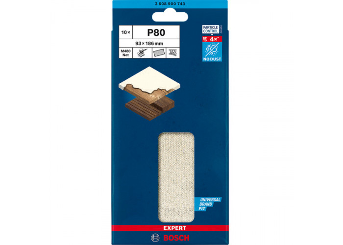 - Шліфувальний папір Bosch Expert M480, 93×186 мм, G80 призначений для обробки деревини, шпаклівок і лакофарбових покриттів, де потрібне якісне вирівнювання поверхні та ефективне видалення матеріалу.