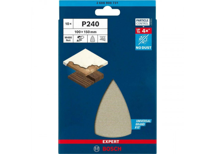 • Шліфувальна сітка Bosch Expert M480 розміром 100x150 мм має трикутну форму і поставляється в упаковці по 10 шт.