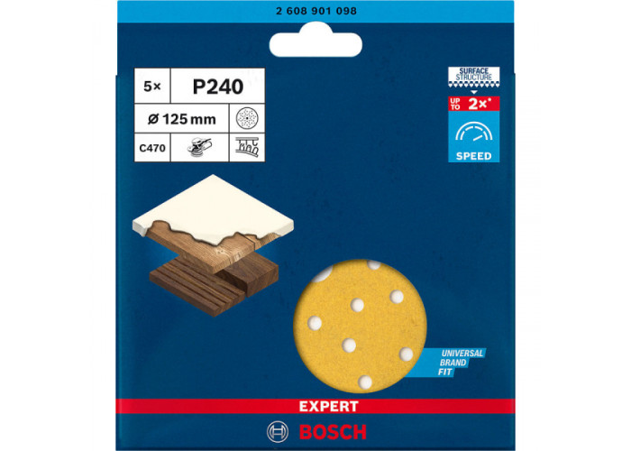 - Шліфувальний круг Bosch Expert C470 з діаметром 125 мм та зернистістю 240 розроблений спеціально для використання на ексцентрикових шліфувальних машинах. Він має хорошу швидкість знімання матеріалу при обробці різних поверхонь, таких як дерево, фарба, лак, штукатурка і шпаклівка. Великий розмір шліфувального листа дозволяє ефективно працювати з великими площами.